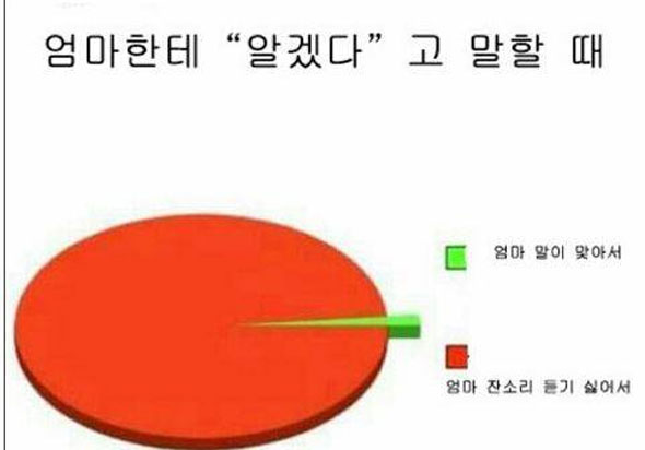 사진 속 그래프는 ‘엄마에게 “알겠다”고 말할 때’라는 제목으로, 절대 다수가 ‘엄마 잔소리 듣기 싫어서’라고 답했다고 표현하고 있다.