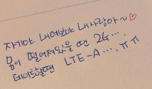 연인들 공감 속도 사진 속에는 한 여자가 자신의 연인에게 쓴 메모가 공개돼 있다. 여자는 "몸이 떨어져 있을 땐 2G, 데이트할 땐 LTE-A"라고 메모를 적었다.