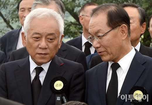 김한길 민주당 대표와 황우여 새누리당 대표가 18일 오전 서울 동작구 국립서울현충원 김대중 전 대통령 묘소를 참배하기 전 이야기를 나누고 있다. 양지웅 기자 yangdoo@