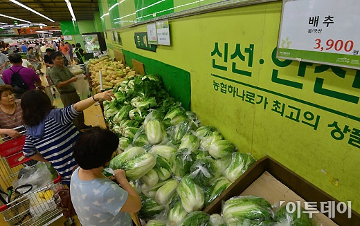 유래없이 긴 장마와 폭염으로 배춧값이 크게 올라 식탁물가에 비상이 걸렸다. 18일 서울 하나로클럽 양재점을 찾은 시민들이 배추를 고르고 있다. 농식품부는 이달 들어 장마와 폭염으로 출하량이 줄면서 배추 가격이 오르긴 했지만, 다음 달부터 해발 8백 미터 이상 지대의 고랭지배추가 출하되면 배춧값이 안정세를 되찾을 것으로 전망했다. 양지웅 기자 yangdoo@
