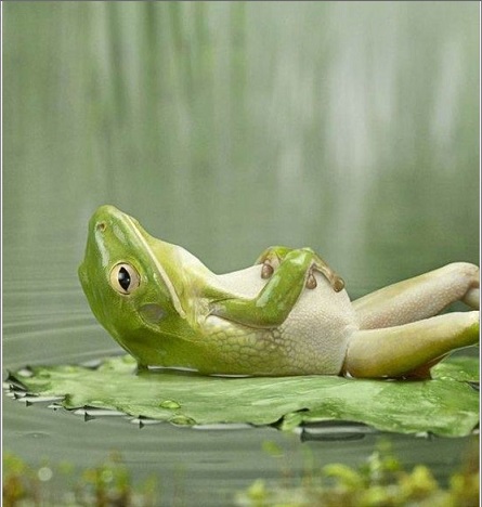 '망연자실 개구리 포착' 2탄 속 개구리는 연잎 위에 누워 모든 것을 체념한 듯한 표정을 짓고 있다.