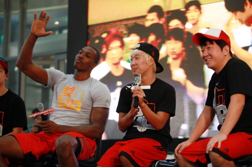 18일 영등포 타임스퀘어에서 열린 ‘NBA 드와이트 하워드 선수 코리아 투어’에서 미국 NBA 선수 하워드가 가수 하하(가운데), 개그맨 정형돈(오른쪽)과 함께 관객들에 인사하고 있다.