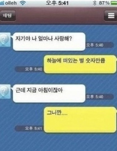 A가 "자기야 나 얼마나 사랑해?"라고 묻자 B는 "하늘에 떠 있는 별 숫자만큼"이라고 답한다. 여기까지는 B가 A를 상당히 사랑하는 것으로 추측할 수 있다.
