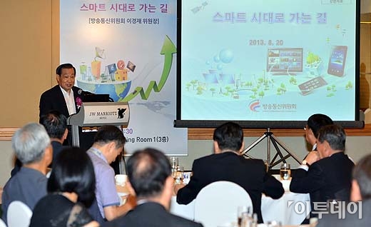 이경재 방송통신위원장이 20일 오전 서울 서초구 반포동 JW메리어트호텔에서 열린 ‘한국 IT 리더스 포럼’에서 ‘스마트 시대로 가는 길’이란 주제로 강연을 하고 있다. 방인권 기자 bink7119@