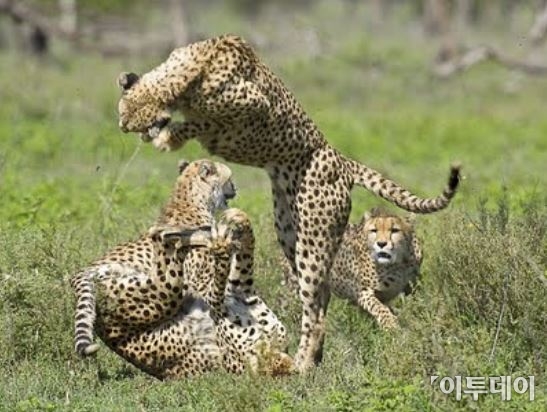 사진 속 치타는 윗몸 전체를 이용해 앞발을 날려 싸우고 있다. 재빠른 움직임에 형태가 뚜렷이 보이지 않을 정도다.