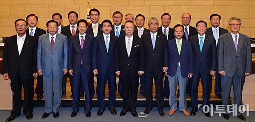 박용만 두산그룹 회장이 21일 오전 서울 중구 남대문로 상의회관에서 열린 ‘대한상공회의소 임시의원 총회’에서 만장일치로 제 22대 대한상공회의소 신임회장으로 선출됐다. 박용만 신임대한상의 회장과 지방상공회의소 회장들이 임시의원 총회를 마친 뒤, 기념촬영을 하고 있다.방인권 기자 bink7119@