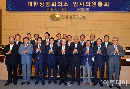박용만 두산그룹 회장이 21일 오전 서울 중구 남대문로 상의회관에서 열린 ‘대한상공회의소 임시의원 총회’에서 만장일치로 제 22대 대한상공회의소 신임회장으로 선출됐다. 박용만 신임대한상의 회장과 지방상공회의소 회장들이 임시의원 총회를 마친 뒤, 기념촬영을 하고 있다. 방인권 기자 bink7119@