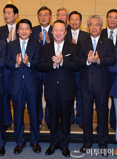 박용만 두산그룹 회장이 21일 오전 서울 중구 남대문로 상의회관에서 열린 ‘대한상공회의소 임시의원 총회’에서 만장일치로 제 22대 대한상공회의소 신임회장으로 선출됐다. 박용만 신임대한상의 회장과 지방상공회의소 회장들이 임시의원 총회를 마친 뒤, 기념촬영을 하고 있다. 방인권 기자 bink7119@
