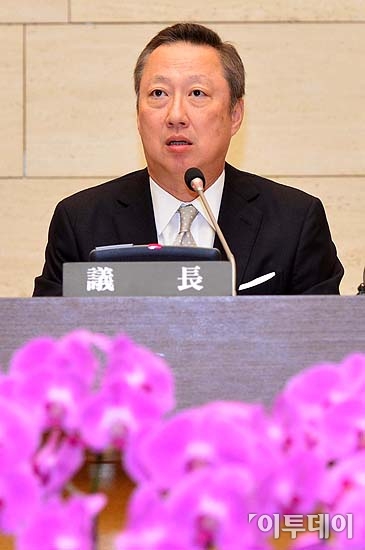 박용만 두산그룹 회장이 21일 오전 서울 중구 남대문로 상의회관에서 열린 ‘대한상공회의소 임시의원 총회’에서 만장일치로 제 22대 대한상공회의소 신임회장으로 선출됐다. 박용만 신임대한상의 회장이 임시의원총회를 주재하고 있다. 방인권 기자 bink7119@