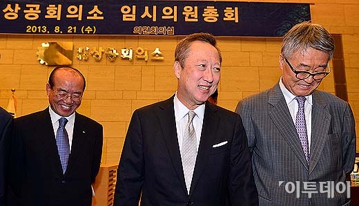 박용만 두산그룹 회장이 21일 오전 서울 중구 남대문로 상의회관에서 열린 ‘대한상공회의소 임시의원 총회’에서 만장일치로 제 22대 대한상공회의소 신임회장으로 선출됐다. 박용만 신임대한상의 회장과 지방상공회의소 회장들이 임시의원 총회를 마친 뒤, 총회장을 나서고 있다. 방인권 기자 bink7119@