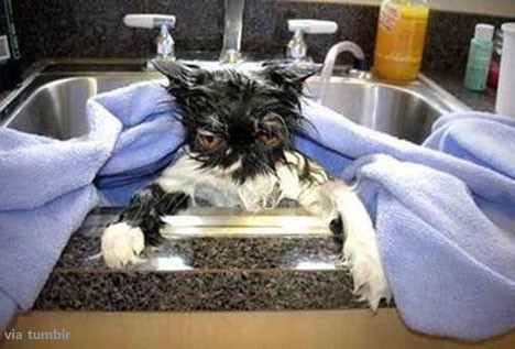 사진 속에는 고양이 한 마리가 복수를 다짐하는 듯한 눈빛으로 주인을 노려보고 있다. 주인이 강제로 목욕을 시키자 화가 난 것이다.