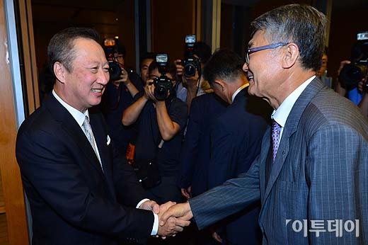 박용만 대한상공회의소 신임회장이 21일 오후 서울 중구 남대문로 상의회관에서 열린 ‘대한-서울 상공회의소 회장 취임식’에서 참석자들과 악수를 나누고 있다. 방인권 기자 bink7119@