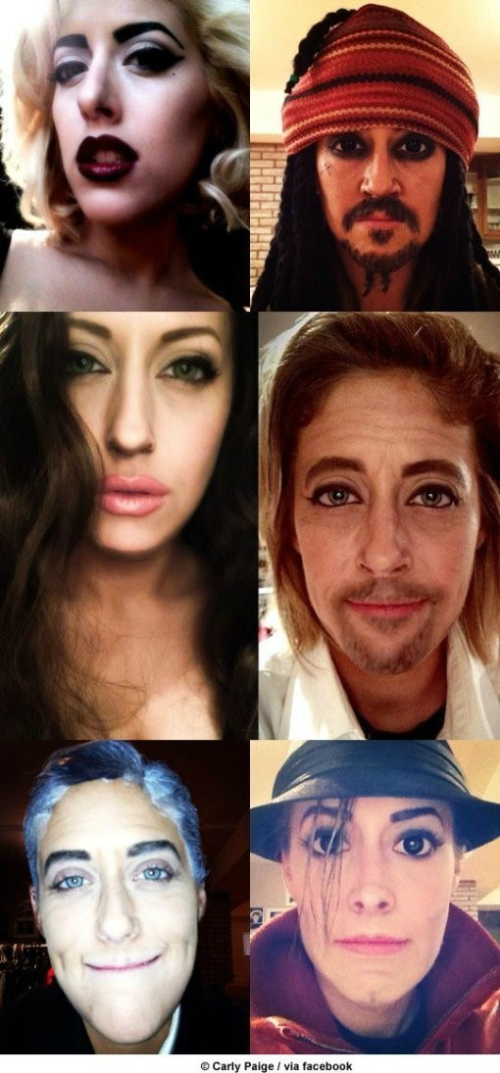 사진 속 여성은 할리우드 스타 조니 뎁부터 안젤리나 졸리까지 완벽히 재현해 냈다. 이들 뿐 아니라 미국 최고 인기 팝가수인 마이클 잭슨과 현재 최고의 잇걸인 레이디 가가로도 똑같이 분장을 해 놀라움을 자아낸다.