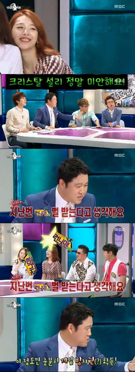 김구라 자신이 게스트로 추천한 개그맨 김경민이 분위기를 어색하게 만들자 함께 출연한 크리스탈과 설리에게 사과하며 "고생이 많다"며 "'런닝맨' 출연했을 때 실수한 거 벌 받는다고 생각하라"고 말한 것.