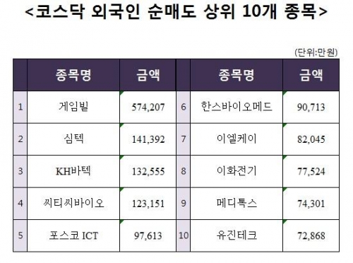 [코스닥 외국인 순매도 상위 10개 종목]