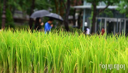 가을의 문턱인 입추를 지나 모기 입이 비뚤어진다는 절기 ‘처서’인 23일 오전 서울 광화문 일대에 놓인 벼가 익어가고 있다. 방인권 기자 bink7119@