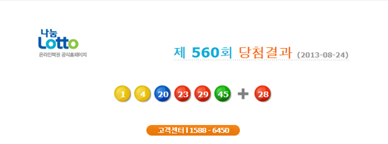 나눔로또가 24일 오후 8시40분 SBS를 통해 생방송으로 560회 로또복권을 추첨한 결과, 당첨번호가 ‘1, 4, 20, 23, 29, 45’로 결정됐다.