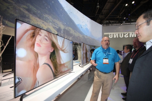 ▲지난 1월 미국 라스베이거스에서 열린 세계 최대 가전전시회 CES2013에서 관람객들이 2013년형 삼성 스마트TV 'F8000'을 살펴보고 있다. 사진제공 삼성전자