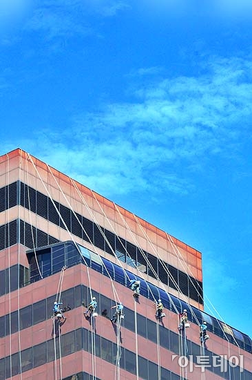 가을을 앞두고 무더운 날씨가 한풀 꺽인 8월의 마지막 일요일인 25일 오전 서울 시내 한 건물에서 청소업체 관계자들이 외벽을 청소하고 있다. 방인권 기자 bink7119@