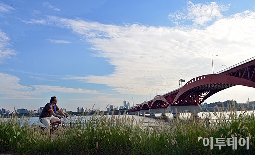 무더위가 한풀 꺽이며 화창한 날씨를 보인 25일 오후 서울 한강 시민공원 망원지구에서 시민들이 자전거를 타며 휴일을 즐기고 있다. 방인권 기자 bink7119@