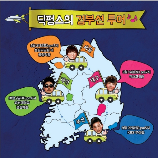딕펑스는 서울을 시작으로 경부선 구간인 대구, 부산, 대전까지 이어지는 이번 전국 투어 콘서트 무대에서 탄탄한 라이브 실력과 감각적인 연주를 유감없이 뽐낼 예정이다. 오는 31일 오후 7시 서울 올림픽공원 올림픽홀에서 열리는 서울 공연을 시작으로 9월 14일 대구, 9월 29일 부산, 10월 9일 대전에서 관객을 만난다.