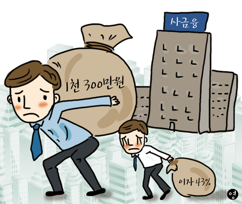 사금융 이용자들이 평균 1300만 원을 빌려 연이자 43%를 내고 있다는 조사 결과가 나왔다. 네티즌들은 “이자 법정상한선을 연 25% 이하로 낮추고, 허가제로 바꿔라”, “대부업체들 이중장부는 공공연한 비밀인데 국세청은 알고도 눈감아주나 아니면 몰라서 두는 건가”, “저도 사금융 써서 지금은 개인회생 중인데요. TV광고 정말 없애야 합니다” 등의 반응을 보였다.