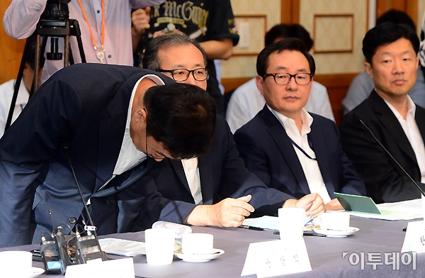 윤상직 산업통상자원부 장관이 26일 오후 여의도 국회에서 열린 당정협의에 참석해 강석호 새누리당 제4정조위원장과 위원들이게 허리 숙여 인사하고 있다. 이날 열린 당정협의에서는 여름철 전력난 해소대책을 비롯해 전기요금 체계개편안 등을 다룰 예정이다. 노진환 기자 myfixer@