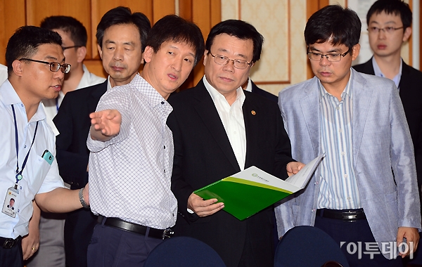 이동필 농림축산식품부 장관(오른쪽 세 번째)이 27일 오전 여의도 국회 귀빈식당에서 열린 당정협의에 참석해 관계자의 보고를 받고 있다. 노진환 기자 myfixer@