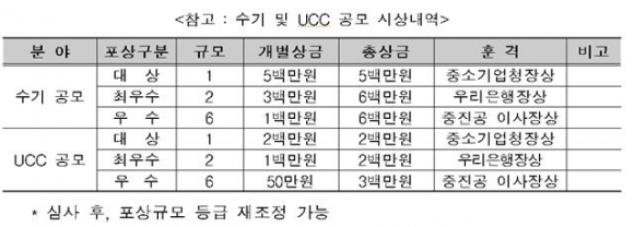 ▲수기 및 UCC 공모 시상내역. 자료제공 중소기업청