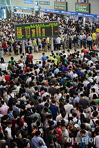 2013년 추석 기차표 창구 예매가 시작된 28일 오전 서울역을 찾은 많은 시민들이 기차표 예매를 위해 긴 줄을 서서 기다리고 있다. 노진환 기자 myfixer@