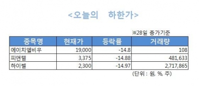 이와 함께 피앤텔(-14.88%), 에이치엘비우(-14.80%)가 하한가로 장을 마감했다.