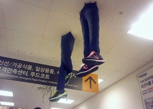 사진 속에는 천정에 매달린 마네킹의 다리에 청바지를 입히고 운동화를 신겨 놓은 모습이 담겨 있다. 이 모습은 마치 사람의 하반신만 천장에 매달린 공포영화 같아 누리꾼들의 시선을 모았다.