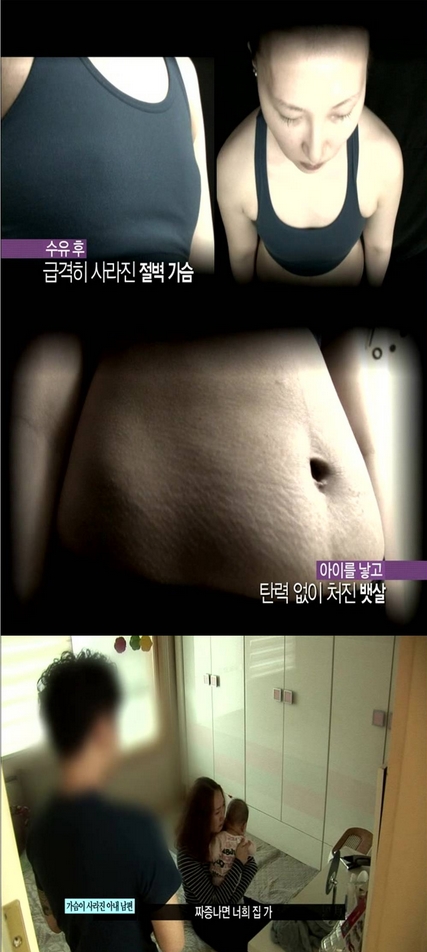 그는 젊은 시절 볼륨감 있는 몸매의 소유자였지만, 수유 후 급격히 사라진 절벽가슴과 두 아이의 출산으로 탄력없이 쳐진 뱃살로 흉한 몸매를 갖게 됐다. 변해버린 몸보다 견딜 수 없는 건 그녀를 투명인간 취급하는 남편의 냉담한 태도다.