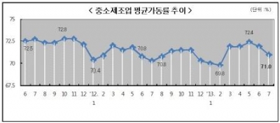 중소기업중앙회는 1383개 중소제조업을 대상으로 실시한 가동률조사 결과 7월 중소제조업 평균가동률은 전월(71.9%)보다 0.9%포인트 하락한 71%로 나타났다고 29일 밝혔다. 이는 6월에 이어 2개월 연속 하락한 것이다.