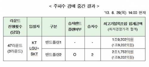 한편 주파수 경매는 29일 9시부터 경기도 성남시 분당 정보통신기술협회(TTA)에서 48라운드가 진행된다.