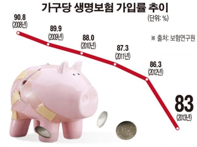 생명보험의 가구당 가입률은 2008년 90.8%를 기록한 뒤 2009년 89.9%, 2010년88%, 2011년 87.3%, 2012년 86.3%, 2013년 83%로 5년 만에 7.8%포인트 하락했다.