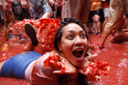 28일(현지시간) 스페인 발렌시아의 브뇰에서 열린 토마토축제(La Tomatina)의 모습을 포토 슬라이드로 구성했다. 매년 8월 마지막주 수요일에 열리는 이번 축제에도 130톤이 넘는 토마토가 사용되면서 거리 곳곳을 붉게 물들였다. 1944년 토마토 값 폭락에 분노한 농부들이 항의의 표시로 시의원들에게 토마토를 던진 것에서 시작된 이 축제는 얼마전 CNN이 선정한 세계 유명축제중의 하나로 손꼽히기도 했다. 한편 그동안 무료로 진행된 축제는 올해 처음으로 1인당 10유로(약 1만5000원)의 참가비를 받은 사실이 알려지면서 화제가 되기도 했다.