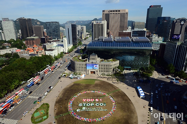 서울시와 대학생 환경단체 ‘대자연’이 2일 오전 서울광장에서 기후변화 방지, 온실가스 감축을 촉구하는 퍼포먼스를 펼치고 있다. 이번 퍼포먼스에서 ‘대자연’ 소속 대학생 200여명이 모여 전 세계 기후변화 방지를 위해 즉시 행동에 나설 것을 촉구하는 메시지 ‘YOU & I Stop CO₂’를 전달하고 있다. 노진환 기자 myfixer@