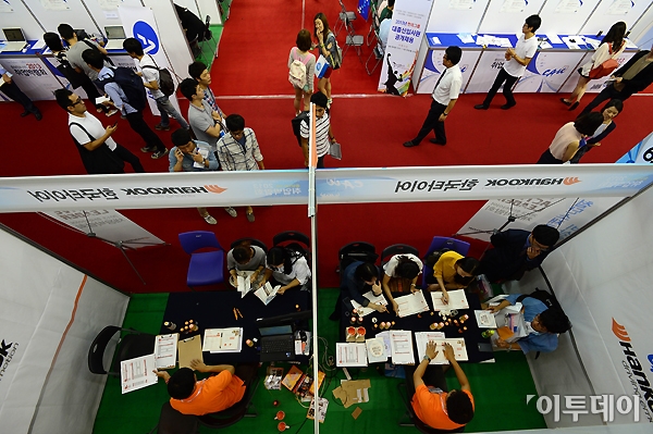 중앙대학교 2013 취업박람회가 2일 오후 동작구 중앙대학교 흑석캠퍼스 체육관에서 열렸다. 박람회장을 찾은 학생들이 취업상담을 받고 있다. 이날 열린 취업박람회에는 삼성, LG, 두산, SK, 한국가스공사 등 120여 곳의 대기업 및 공기업이 참가했다. 노진환 기자 myfixer@
