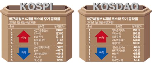 에프엔가이드에 따르면 박근혜 정부 출범 이후 6개월(2월25일~8월30일)동안 유가증권시장의 경우 KC그린홀딩스가 168.82% 오르며 가장 많은 상승률을 기록했다. 이 회사는 중국 등 글로벌 환경 규제와 환경 서비스, 친환경 제조, 신재생 에너지 부문의 성장기반 확대에 힘입어 실적이 호조를 보이고 있다.