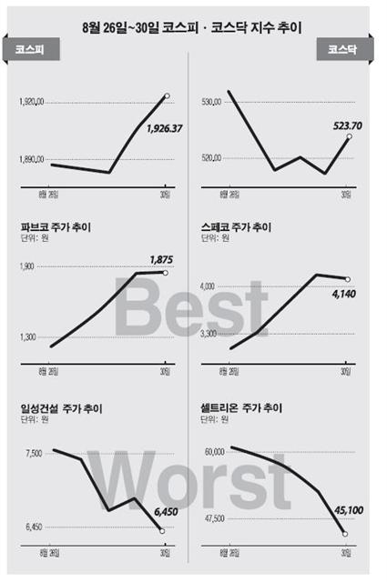 8월 다섯째주(26~30일) 코스피 시장은 미국 양적완화 축소 우려가 진정된 가운데 외국인들의 매수세가 이어지며 1900선을 회복했다. 지난달 30일 코스피지수는 전주 대비 56.20포인트(3.01%) 오른 1926.36에 거래를 마감했다. 장 중반 시리아 군사공격 우려로 금융시장이 불안한 모습을 보이기도 했지만 외국인의 순매수세가 지속되면서 코스피는 8거래일 만에 1900선을 회복했다. 지난주 외국인과 기관은 각각 9000억원, 4300억원을 순매수한 반면 개인은 1조1000억원을 순매도했다. 지난주에는 파브코, 써니전자, 이월드 등이 상승률 순위 1~3위를 차지했고 일성건설, 한구전자홀딩스, 현대상선 등이 하락률 상위권에 자리했다.