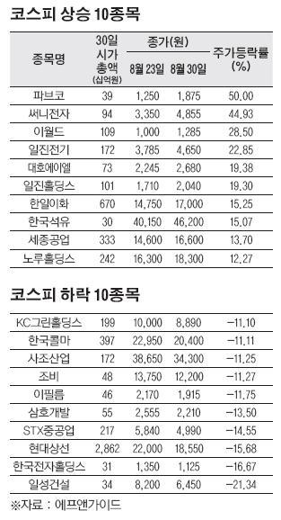 ◇파브코, 50% 상승… 회사 측 “시황변동 사유 없어” = 3일 에프앤가이드에 따르면 지난 26일부터 30일까지 가장 높은 상승률을 보인 종목은 파브코로 나타났다. 이 종목의 이 기간 상승률은 50.00%로 주가는 1250원에서 1875원으로 올랐다.