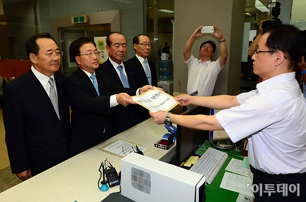 이동근 대한상공회의소 상근부회장(왼쪽 두 번째)과 전국 상공회의소 회장단 대표들이 3일 오전 서초동 대법원 민원실에서 통상임금 탄원서를 제출하고 있다. 노진환 기자 myfixer@