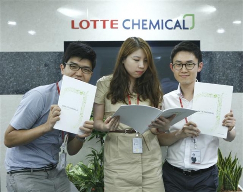 ▲3일 롯데케미칼 직원들이 2012 지속가능경영보고서를 살펴보고 있다. 사진제공 롯데케미칼