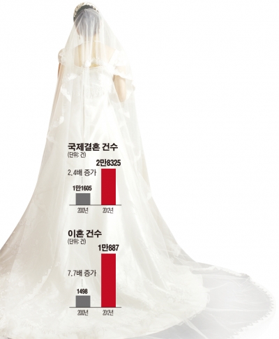 한편 국제결혼은 2000년 1만1605년에서 2012년 2만 8325건으로 2.4배 증가했다. 그 중 한국남성과 외국여성과의 결혼은 같은 기간 6945건에서 3배 증가한 2만637건이었다. 한국여성과 외국남성도 4660건에서 7688건으로 1.7배 늘었다.