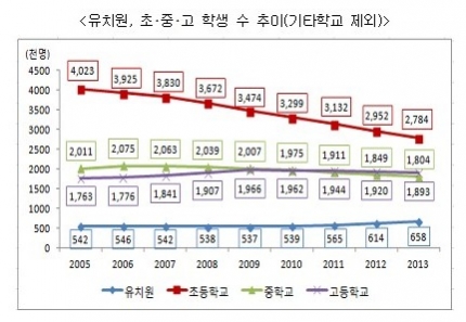 초등학생 수는 278만4000명, 중학생 수는 180만4189명, 고등학생 수는 189만3303명으로, 전년대비 각각 16만7995명(5.7%), 4만4905명(2.4%), 2만6784명(1.4%) 줄어들었다. 특히 초등학생 수는 2005년에만 해도 400만명이 넘었지만 세계 최저 수준의 출산율 영향으로 8년새 123만9000여명이 감소했다.