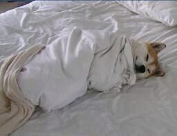 사진 속 강아지는 침대에서 이불을 돌돌 말고 있다.