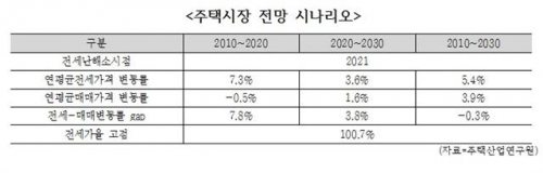 주산연은 근거로 매매수요는 줄고 전세수요는 늘어나고 있다는 점을 제시했다. 현재 주택시장 흐름대로라면 2020년까지 매매가격은 연평균 0.5% 하락하는 반면 전세가격은 연평균 7.3% 상승해 2021년에는 전세가율이 최고점인 100.7%에 달할 것이라는 분석이다.