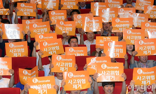 ‘안전수칙 준수 범국민 결의대회’가 4일 오후 삼성동 한국전력 본사에서 열렸다. 참석자들이 ‘사고위험 제거’를 외치며 안전수칙 준수를 다짐하고 있다. 노진환 기자 myfixer@