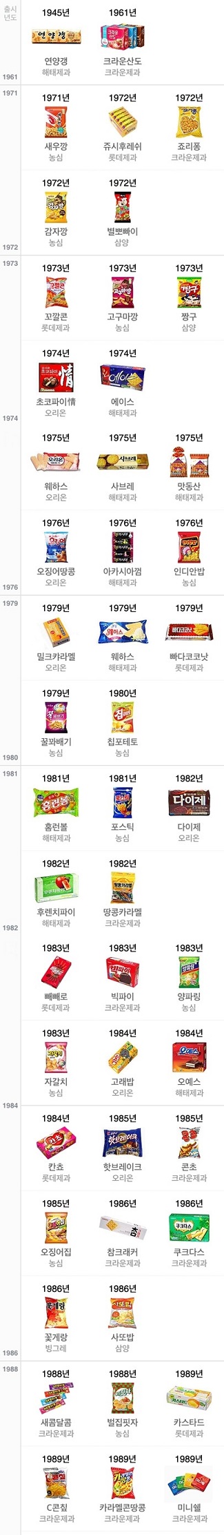 과자들의 출시년도를 살펴보면 가장 나이가 많은 과자는 해태제과의 '연양갱'으로 1945년생, 환갑을 훌쩍 넘었다.